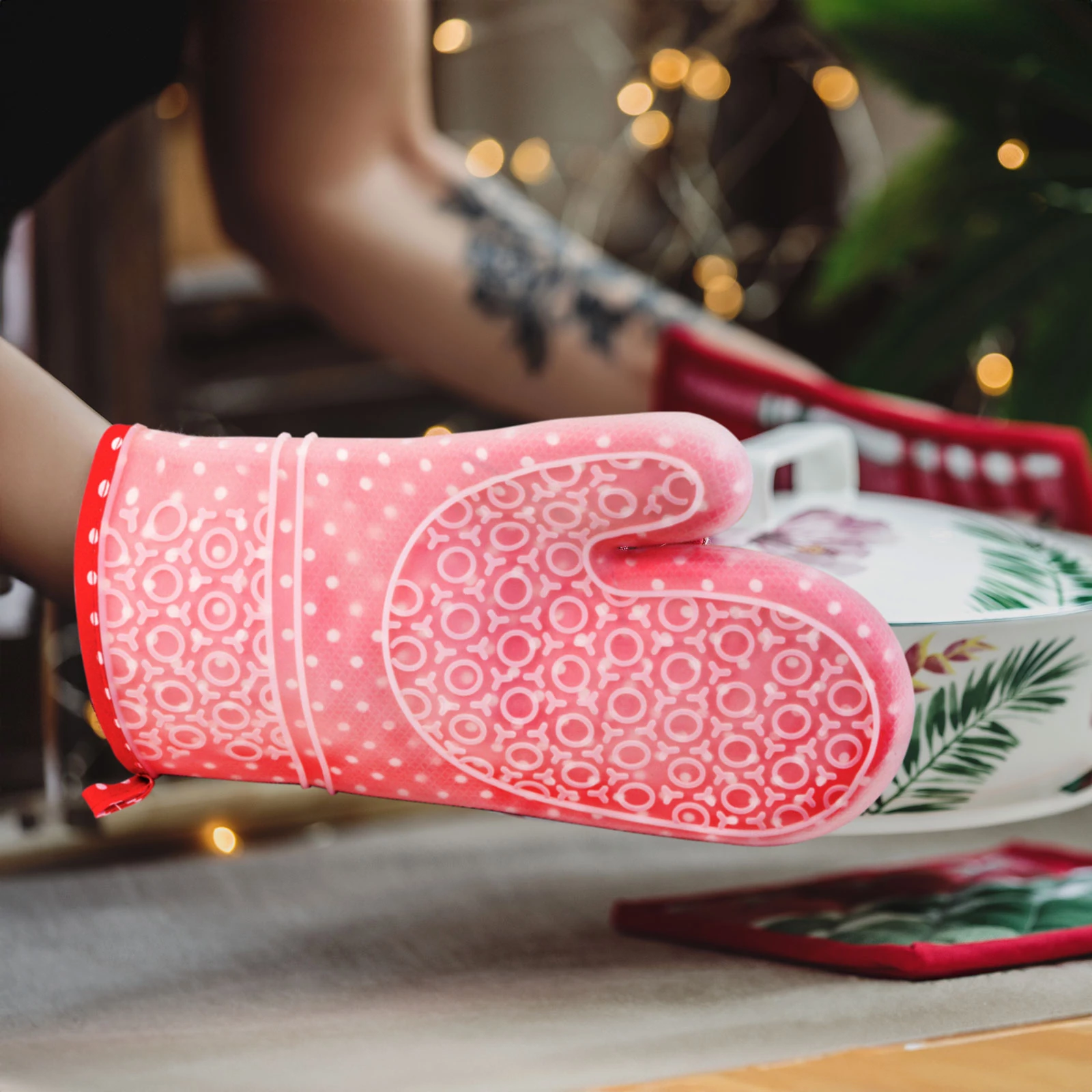 Ez az edényfogó kesztyű egy kiváló minőségű és praktikus konyhai eszköz, amely megkönnyíti a forró edények és tepsik biztonságos kezelését. A kesztyű különleges szilikon borítással rendelkezik, amely extra védelmet nyújt és lehetővé teszi, hogy könnyedén fogja a forró felületeket anélkül, hogy megégetné kezét. A szilikon borítás könnyen tisztítható és vízhatlan felületet képez a kesztyűn. A borítást kiváló hőállóság jellemzi, így akár nagyon magas hőmérsékleteket is elvisel, anélkül hogy megsérülne vagy károsodna. Ezáltal bátran használhatja a kesztyűt például a sütőből vagy a mikrohullámú sütőből kivett forró edényeknél. Az edényfogó kesztyű kényelmesen illeszkedik a kézre, és a szilikon borítás kiváló tapadást biztosít, így biztonságosan foghatja meg az edényeket. A kesztyű kétoldalas kialakítású, így mindkét kézre tökéletesen felhúzható. Használatával megelőzhető az égési sérülés!