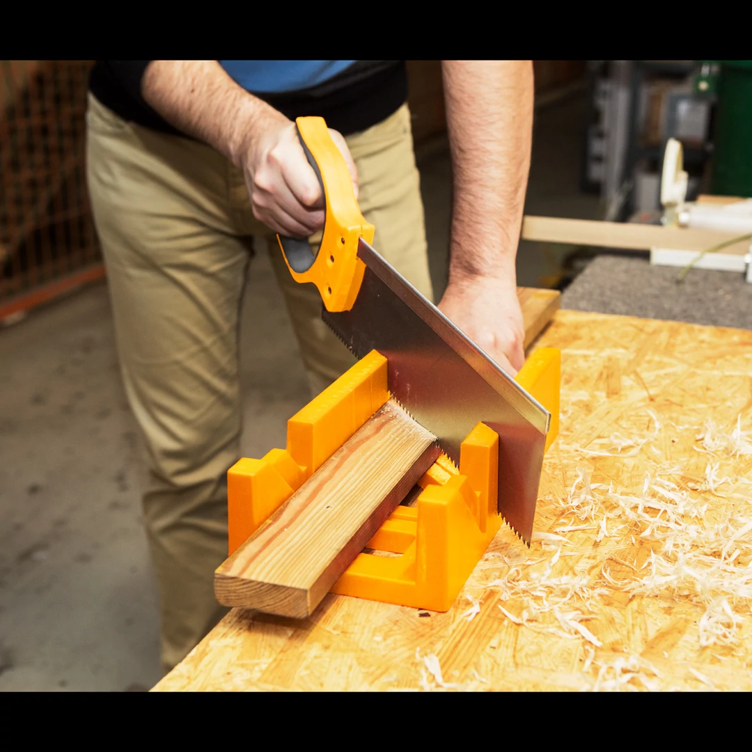 - 2 részes gérvágó készlet egy 350 mm hosszúságú fafűrészből és egy műanyag, 300 mm-es gérvágó dobozból áll