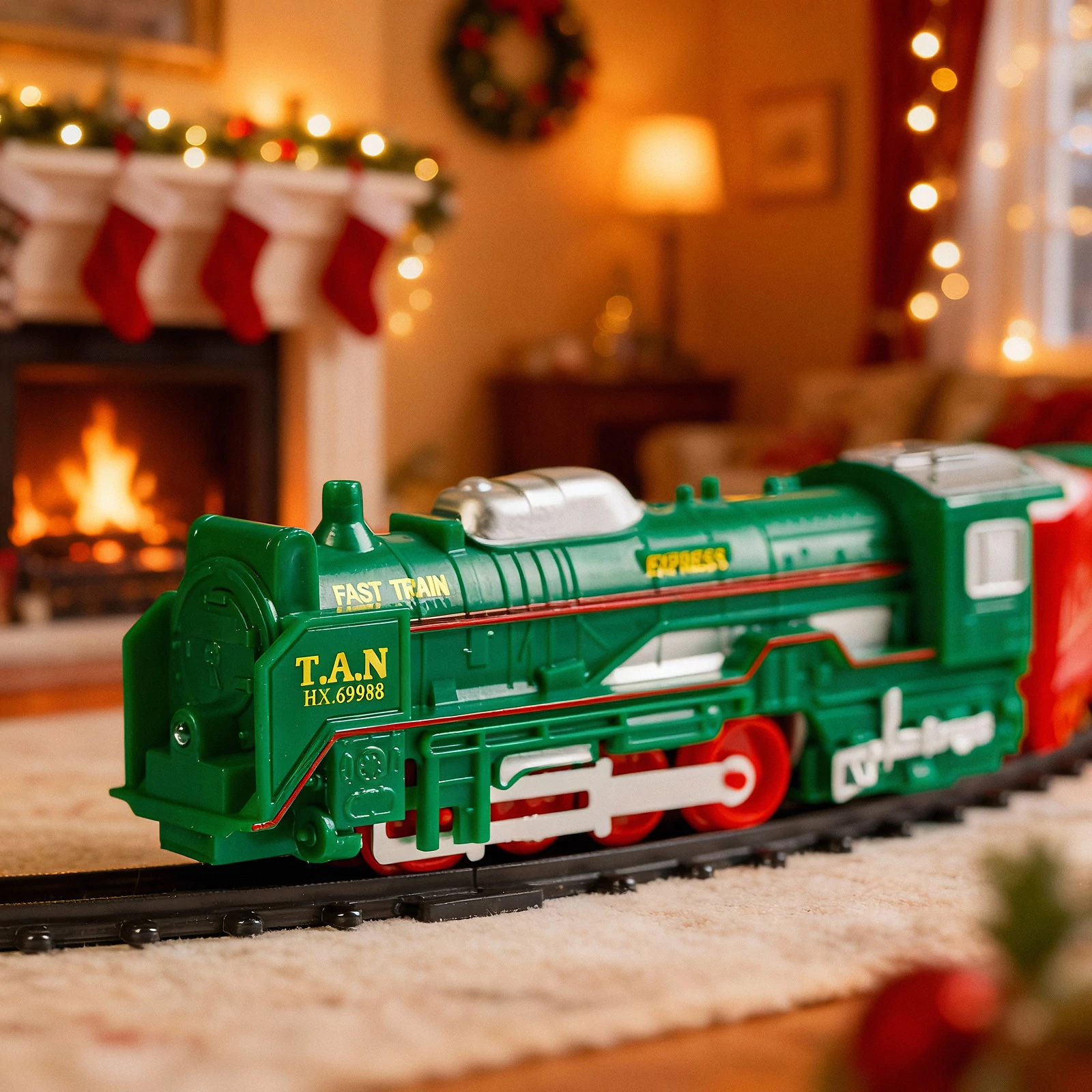 | A készlet tartalma: | 1 mozdony - 13 cm 1 szán Mikulással - 9,5 cm 1 piros színű vagon - 8 cm 1 zöld színű vagon - 10 cm 15 db sín (10 db íves, 4 db rövid, egyenes, 1 db kereszteződés) |