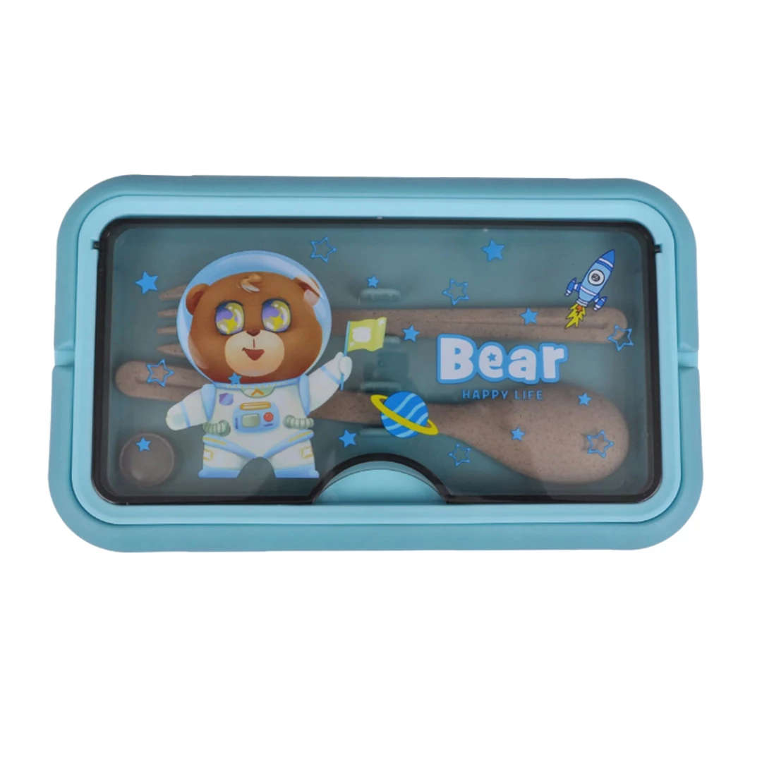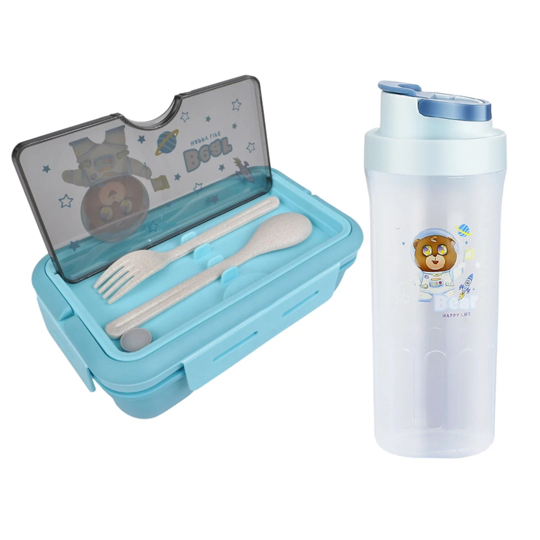 Étkeződoboz vizespalackkal és evőeszközökkel gyerekeknek kék színben