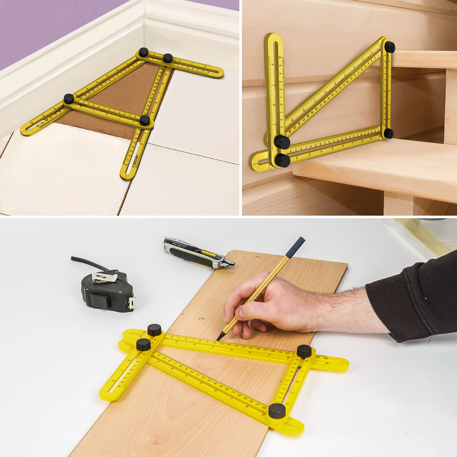 Multifunkciós négyoldalú vonalzó és szögmásoló eszköz. Használatával könnyen és gyorsan dolgozhat nehezen hozzáférhető helyeken is. A nagyméretű tekerőszorítókkal stabilan rögzíthető a kívánt szög. Ideális lehet párhuzamos vonalak, szögek rajzolásánál, csempézésnél, térkő, laminált padló lerakáskor, ha a hiányzó darabot meghatározott szögben vágni szükséges.