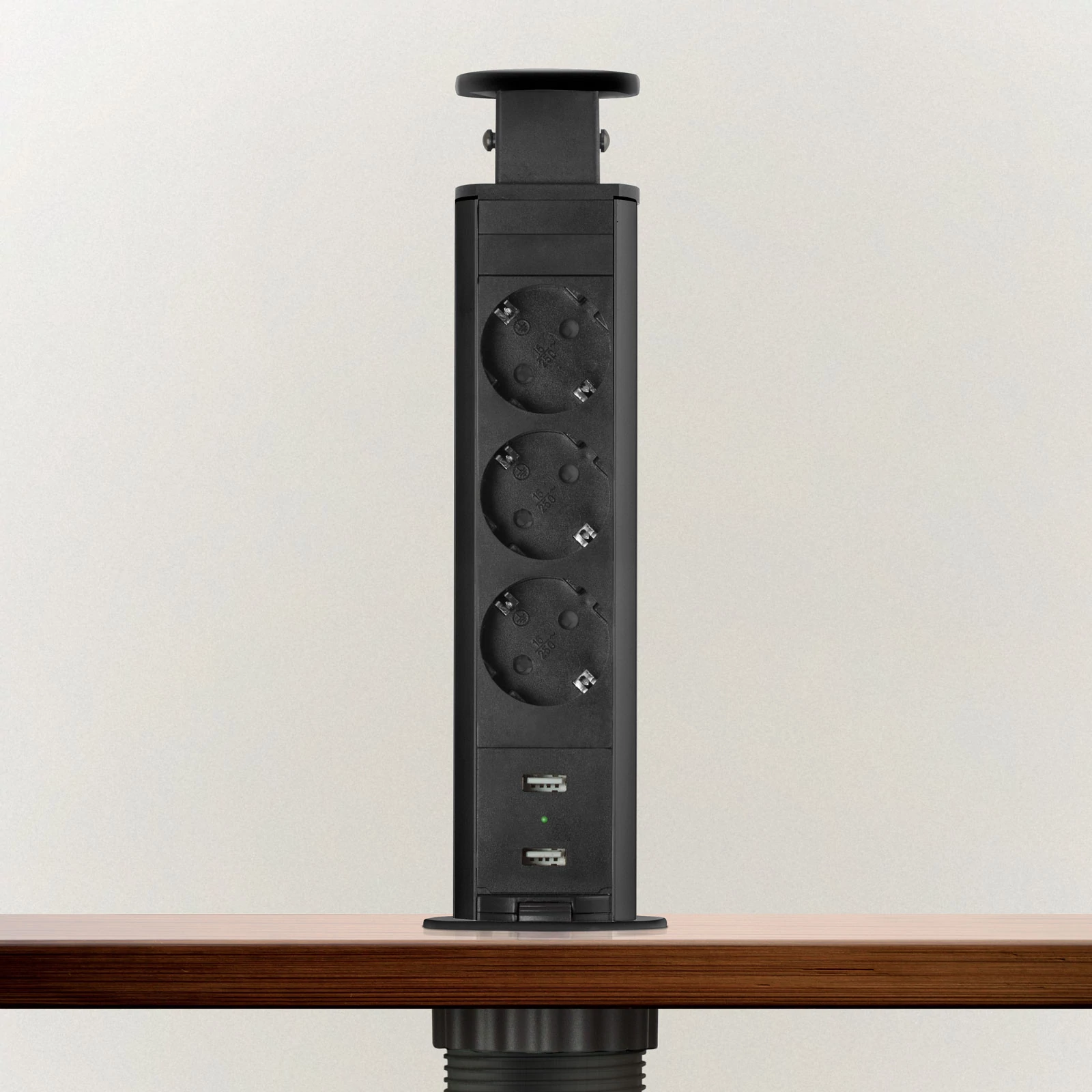 Süllyeszthető elosztó irodai és otthoni felhasználásra, fém házzal, 3 db gyermekvédelemmel ellátott aljzattal és 2 db USB csatlakozóval. Asztala, bútora legyen mindig elegáns és rendezett, mégis funkcionális. Az USB aljaztról könnyen töltheti telefonját, tabletjét vagy egyéb digitális eszközeit. A rejtett elosztó kiváló megoldás lehet ha már például kész konyhával rendelkezik, de nincs elegendő konnektor a kívánt helyen. Ilyenkor falvésés és villamos hálózat bővítés nélkül, remek alternatíva lehet egy rejtett elosztó. Egy mozdulat és máris rendelkezésre áll 3 szabad konnektor. Ideális lehet olyan elektromos eszközökhöz, amit nem folyamatosan használunk, kenyérpirító, vízforraló... Ha használaton kívül vannak, a "töltőoszlop" egy mozdulattal elrejthető, ezzel is megkönnyítve például a takarítást, valamint rendezett, letisztult külsőt ad a helységnek.