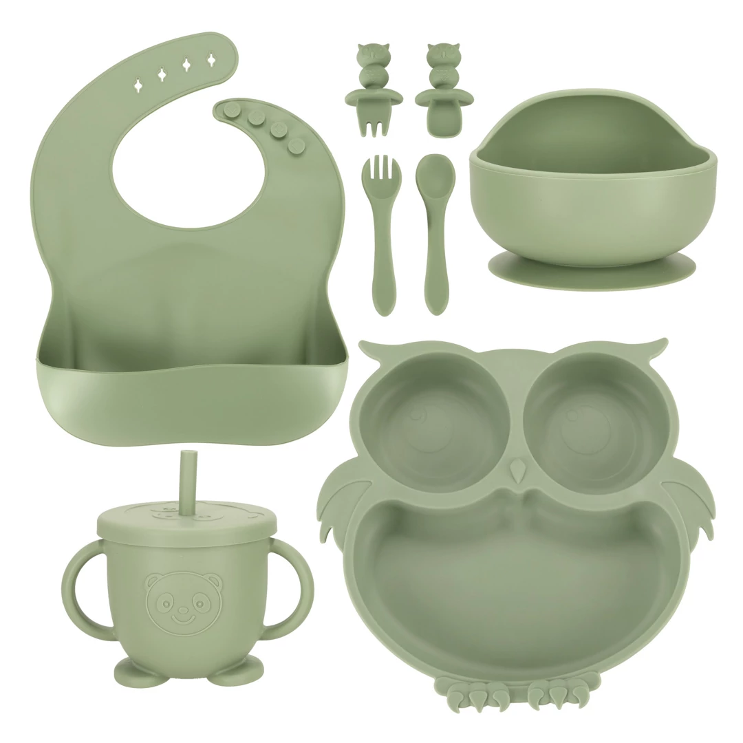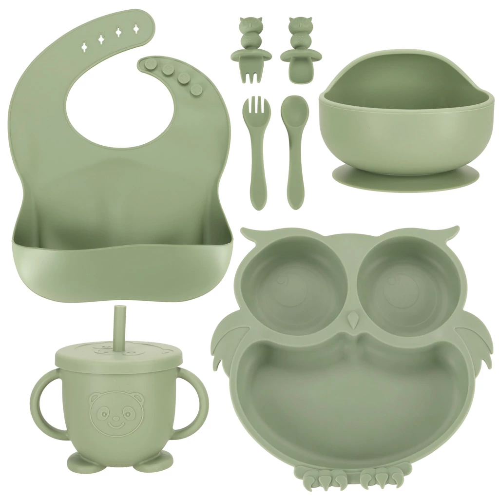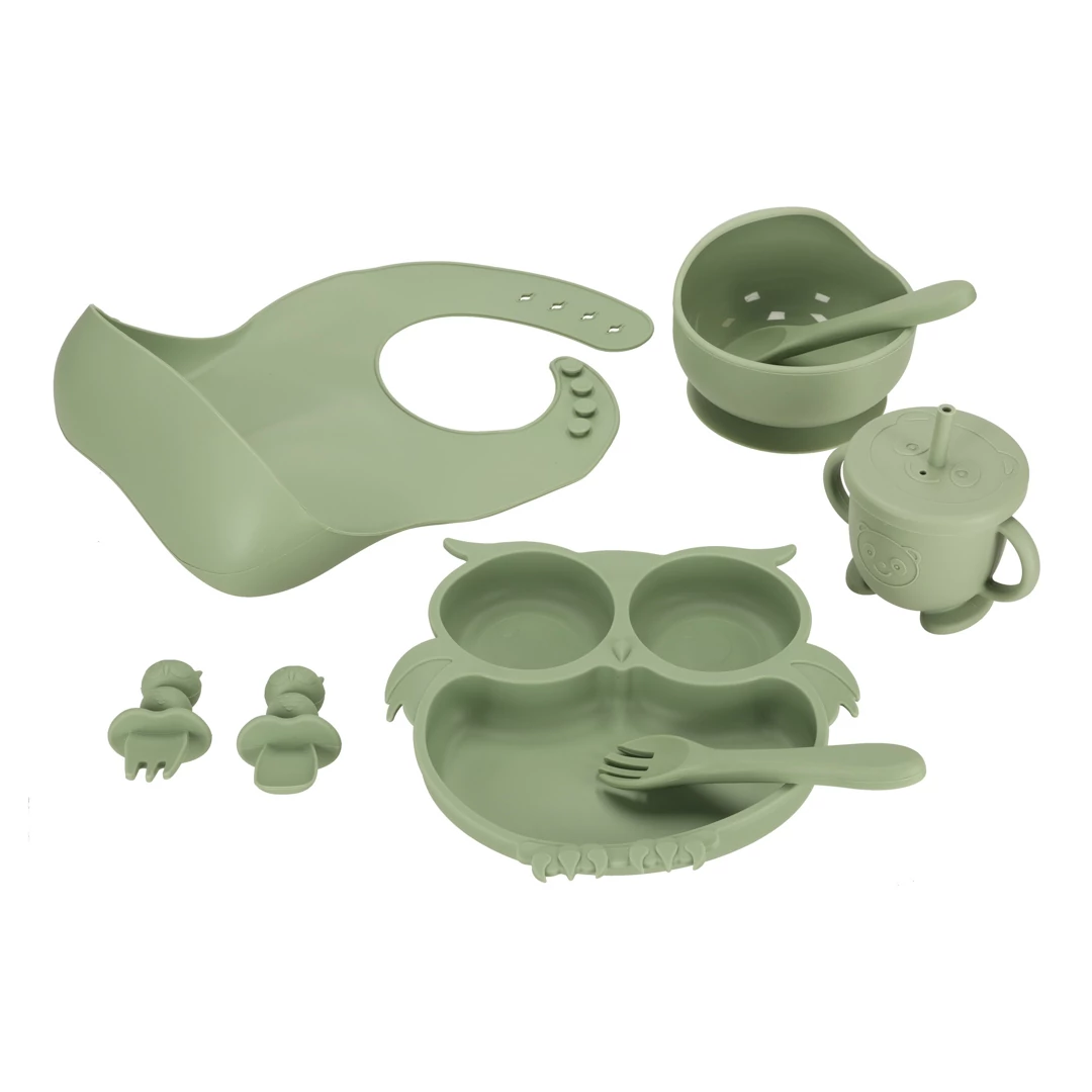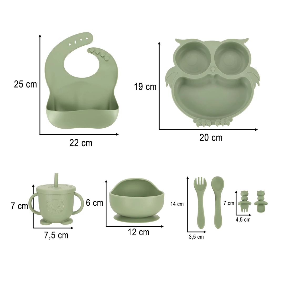 - A szilikon baba edénykészlet biztonságos és praktikus megoldás az önálló étkezés megtanulására. A készlet tartalmaz egy bagoly alakú tányért három rekesszel, egy tálat, egy csészét szívószállal, egy előke zsebbel és két evőeszközkészletet.